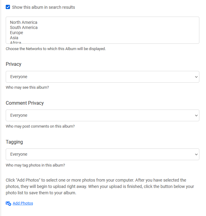 If you wish to create a new album, click on Add New Photos (see below right side of page under search module/box) and a form will appear with questions. Answer the questions, upload your photo's and remember to save at the end of your upload session.